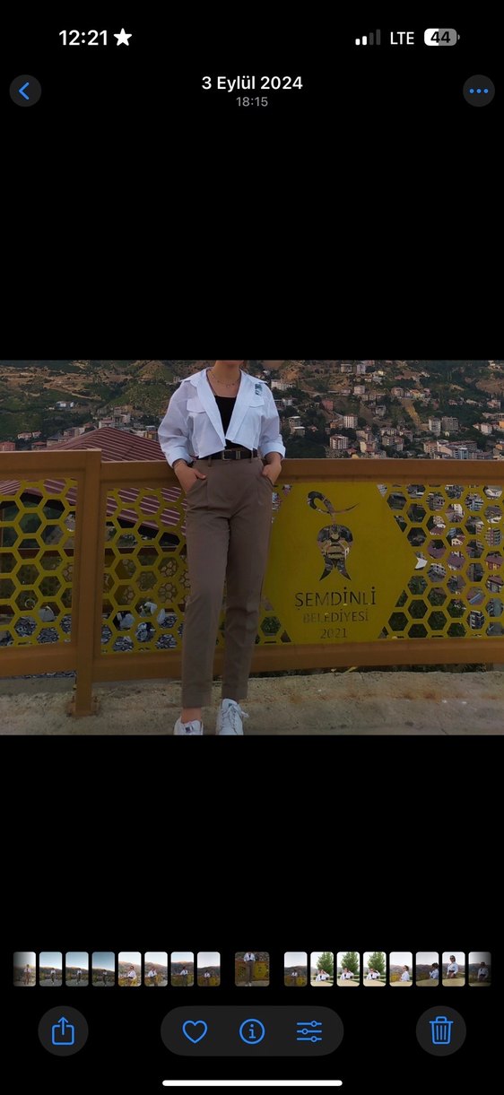 Pamuklu, kemerli, midi boy, normal kesim bej cigarette pantolon. Rahat ve günlük kullanıma uygun sokak tarzı.
