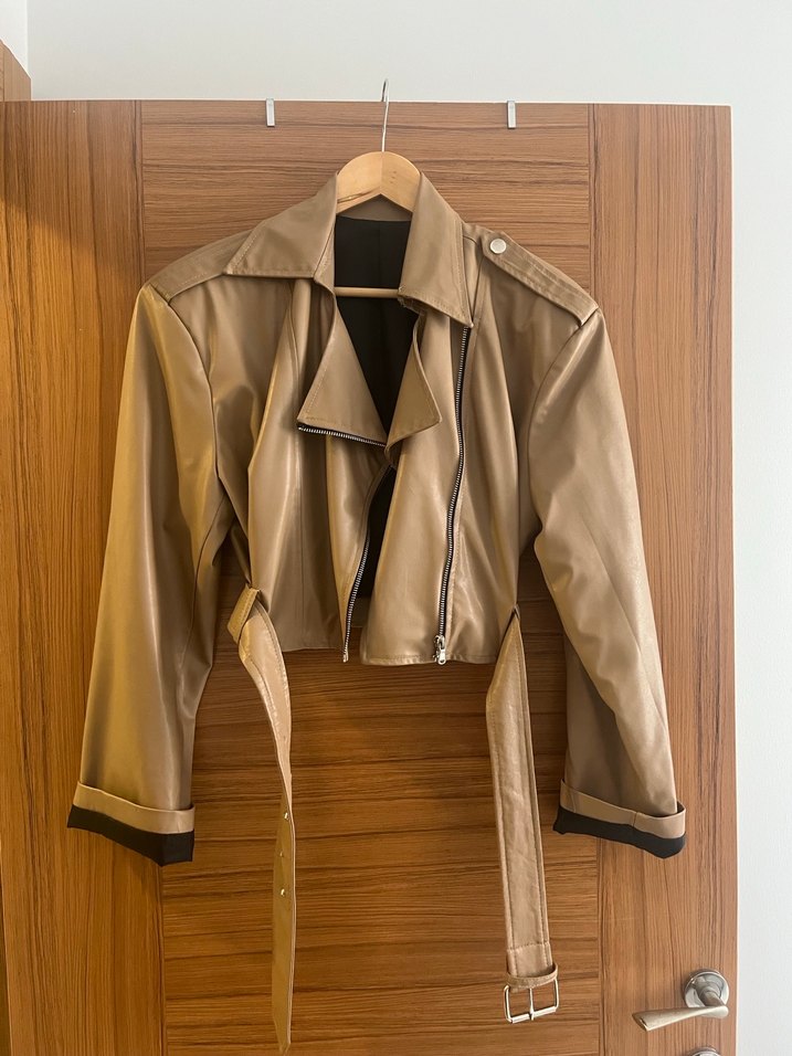 Hiç kullanılmadı diyebilirim küçük geldiği için satıyorum. Bej renkli deri ceket, kemerli ve kesimli yakasıyla trend bir görünüm sunar. Askılı kolları ve kısa, parlak tasarımı günlük kullanıma uygundur.