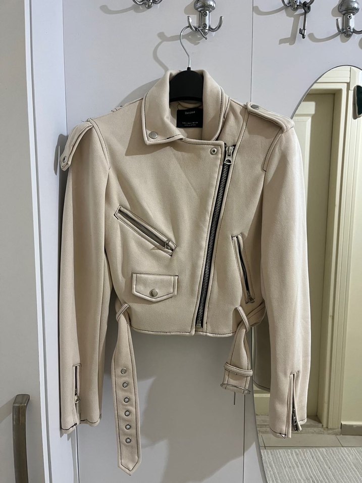 Bej ve gri tonlarında, kemerli ve kısa kesim kadın deri ceket. Şal yaka ve askılı kollara sahip, sokak modasına uygun şık tasarım.