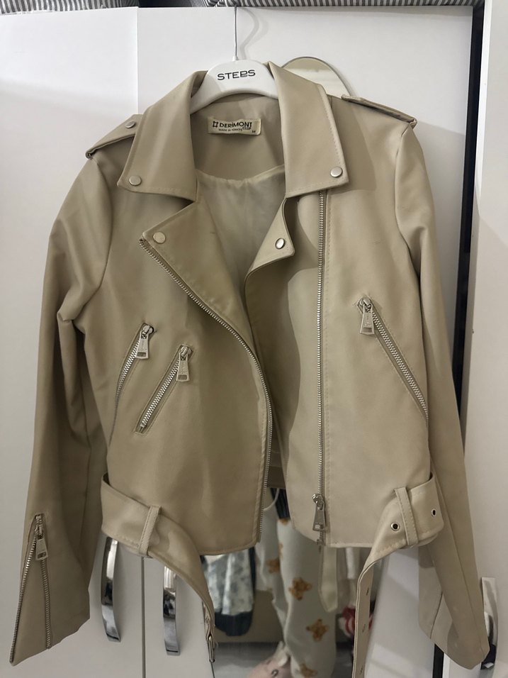Bej renkli, kemerli ve kısa kesim kadın deri ceket. Notlu yakası ve fermuarlı cepleriyle günlük kullanıma uygun şık bir parça. STEES markası bulunur.