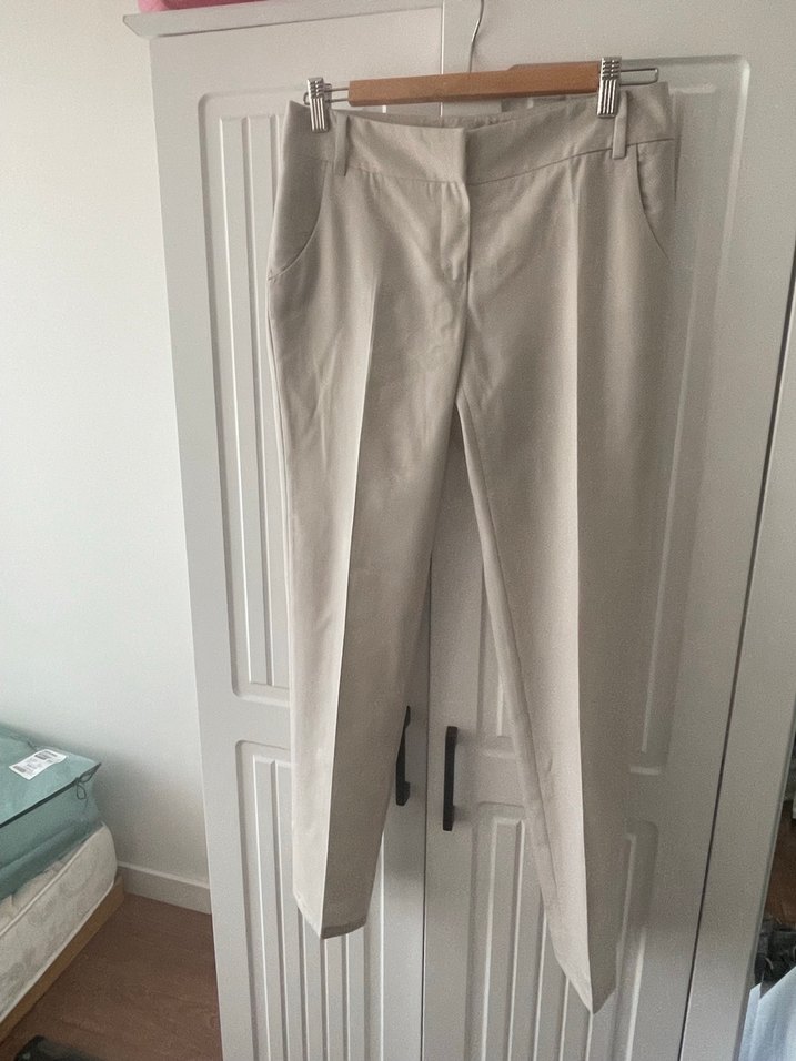 Bej keten kumaştan üretilmiş, kemerli ve midi boy, düz kesim kadın pantolonu. Ofis için uygun, desensiz ve sade tarzda.