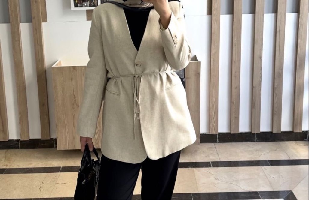 Bej keten kumaştan, kemerli ve normal boy midi blazer. Notch yaka ve askılı kollara sahip, gündelik sokak stili için uygun.