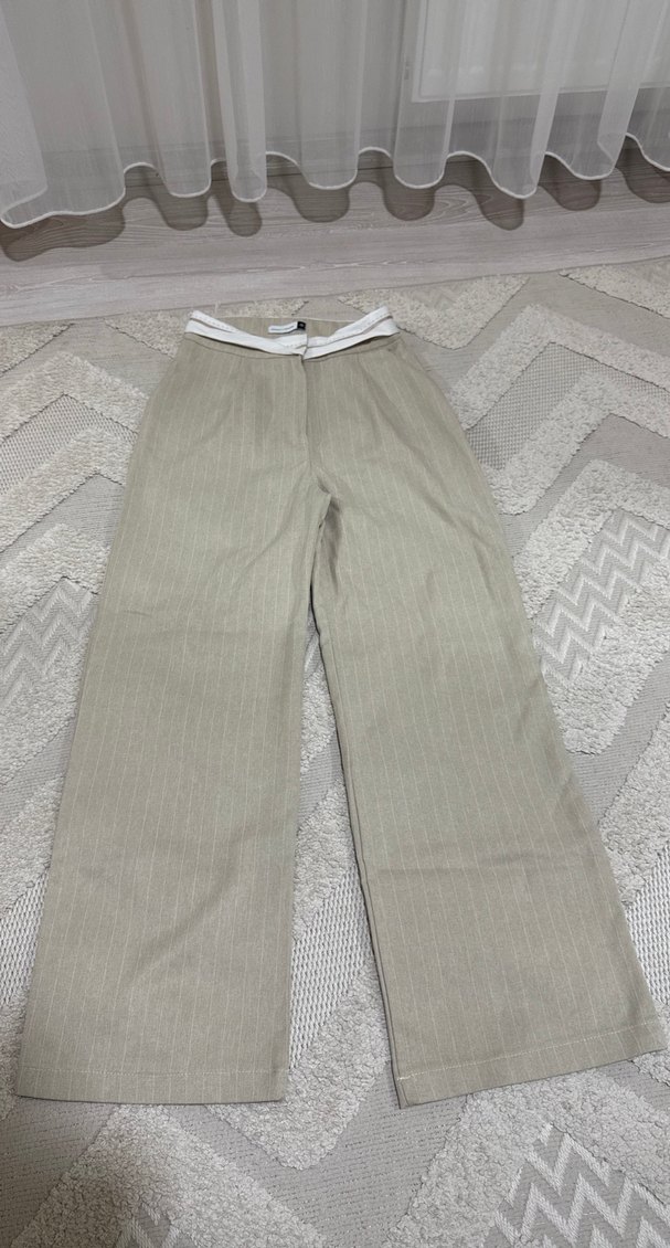 Bej renkli, keten kumaştan yapılmış, kemerli ve kadın pantolonu. Rahat kesimi ve sokak stili ile günlük kullanıma uygundur. ✨