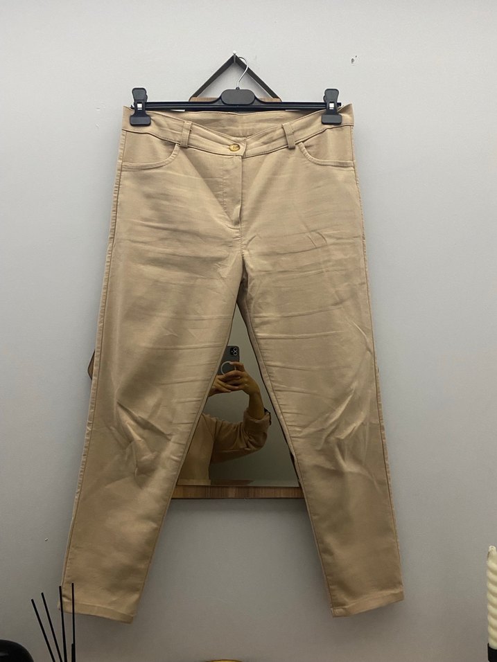 Bej renkli, kemerli ve normal boyda keten kadın pantolonu. Parlak görünümlü, desen içermeyen, günlük sokak stiline uygun rahat kesim.