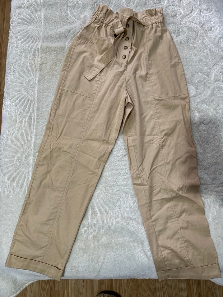 Bej renkte, kemerli ve düğmeli, keten kumaştan yapılmış bol kesim midi boy kadın pantolon. Rahat ve gündelik tarz için uygundur. L bedeni de elimde mevcut