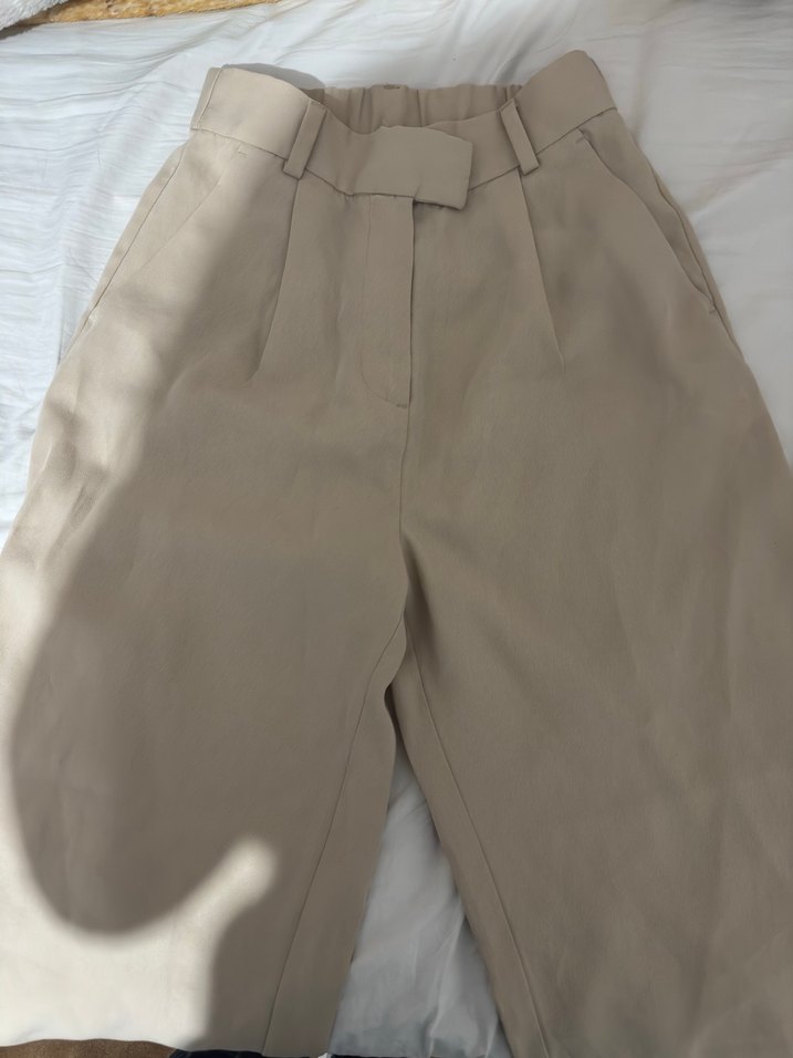 Bej keten kumaştan, kemerli ve midi boy, normal kesim kadın pantolon. Minimalist ve normcore tarzıyla günlük kullanıma uygundur. Hm marka