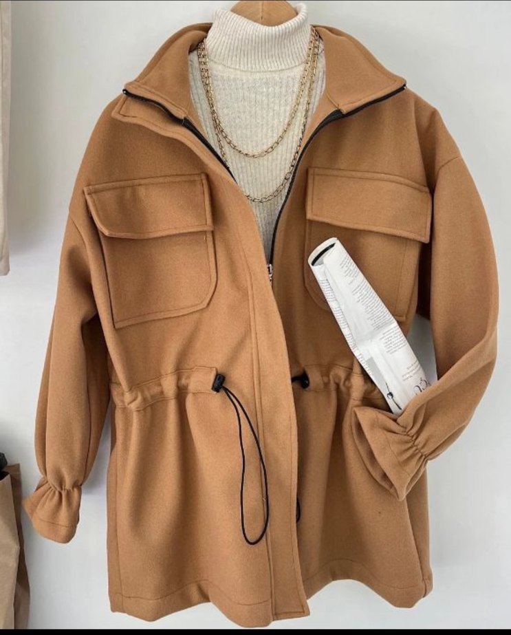 Bej renkte, yüksek yakalı ve uzun kollu kadın kısa mont. Kemer detaylı, bol kesim ve yumuşak sıcak kumaştan üretilmiştir.
