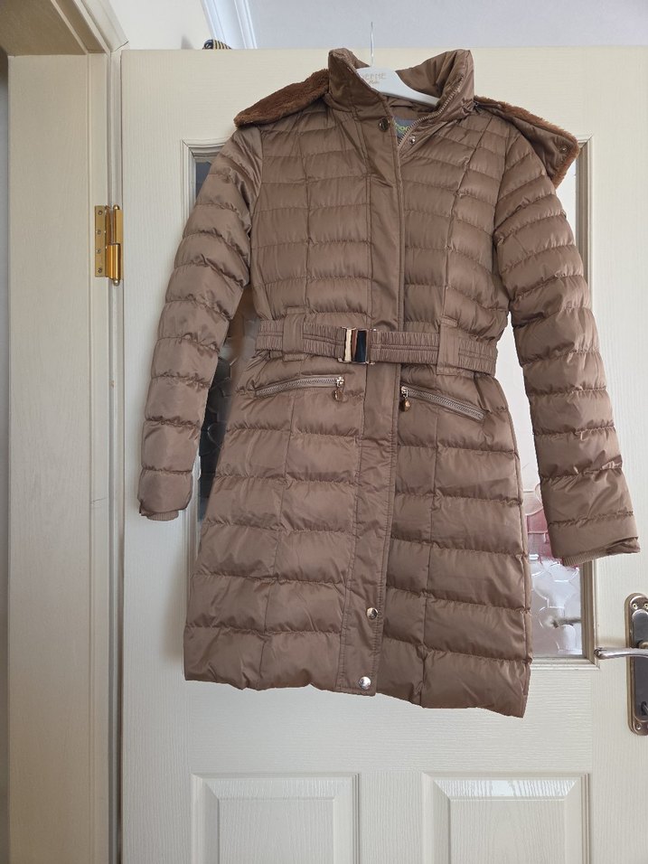 Bej renkli, kemerli ve midi boy kadın kışlık mont. Dar kesim, notched lapel yakalı ve askılı kollu, günlük kullanıma uygun sıcak tutar. ❄️