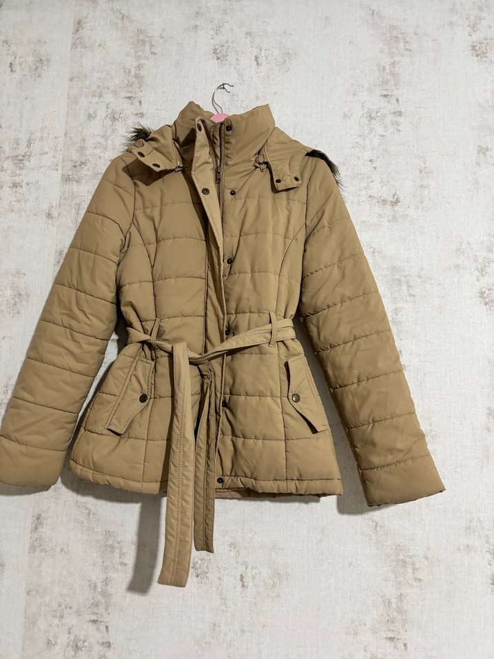 Bej renkli, kemerli ve fitted kesime sahip kadın kışlık mont. Günlük kullanıma uygun, yumuşak ve hafif kumaş.Çok az kullanıldı tertemiz ürün
