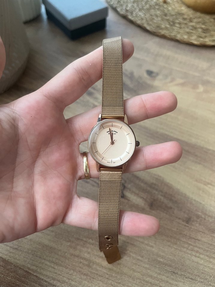 Bej renkli, kemerli tasarıma sahip, ince file kayışlı kadın kol saati. Vintage Paris sokak stilini yansıtıyor. ⌚