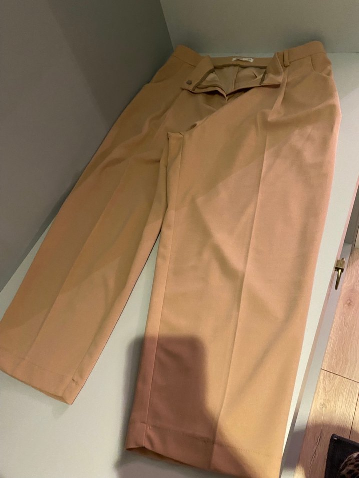 Bej renkte, kemerli, midi boy, regular fit kadın kumaş pantolon. Ofis için uygun, şık ve rahat, yumuşak dokulu kumaştan üretilmiştir.