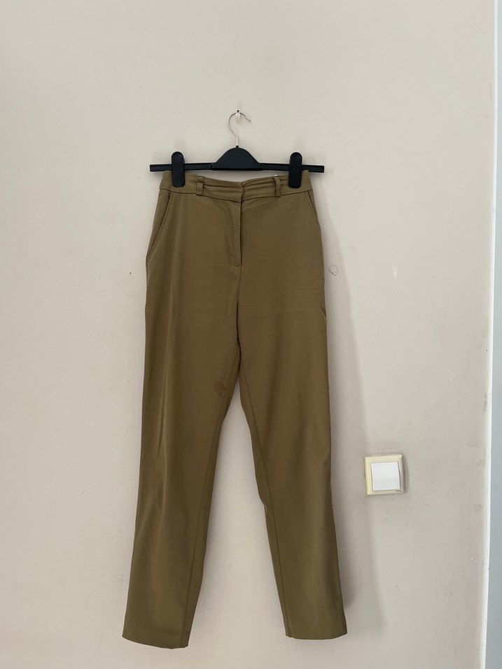 Bej renkte, kemerli, normal boy midi uzunluğunda, sentetik kumaştan yapılmış kadın kumaş pantolon. Minimalist ve ofis stiline uygun.