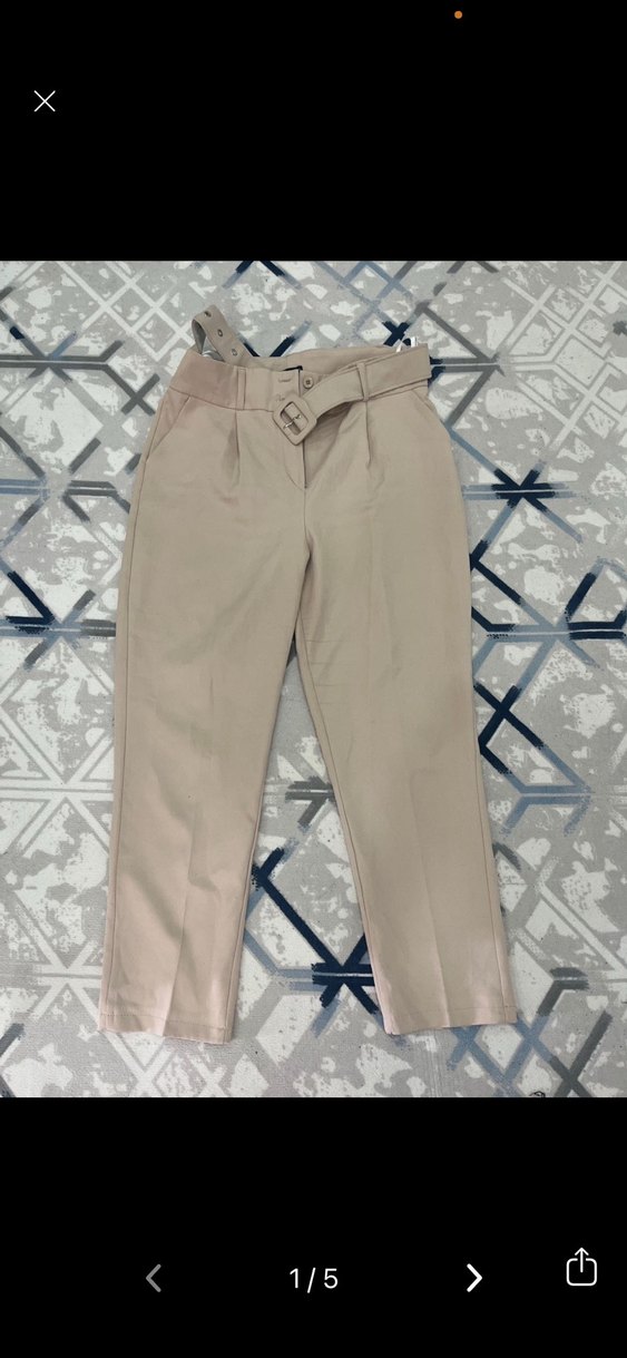Bej renkte, kemerli ve midi boyda, rahat kesimli kadın kumaş pantolon, ofis için uygun düz ve sentetik kumaştan.