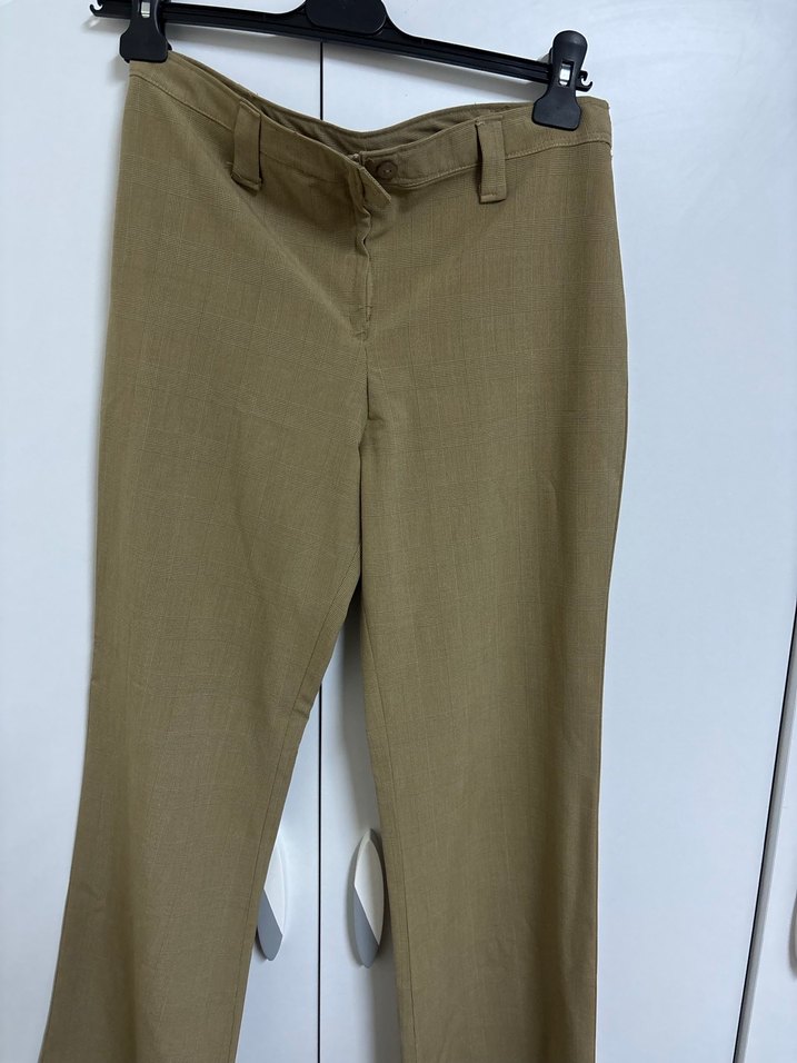 Bej renkli, kemerli, normal kesim kadın kumaş pantolon. Yumuşak keten kumaştan, midi boyda ve ofis kullanımı için uygundur. ✨