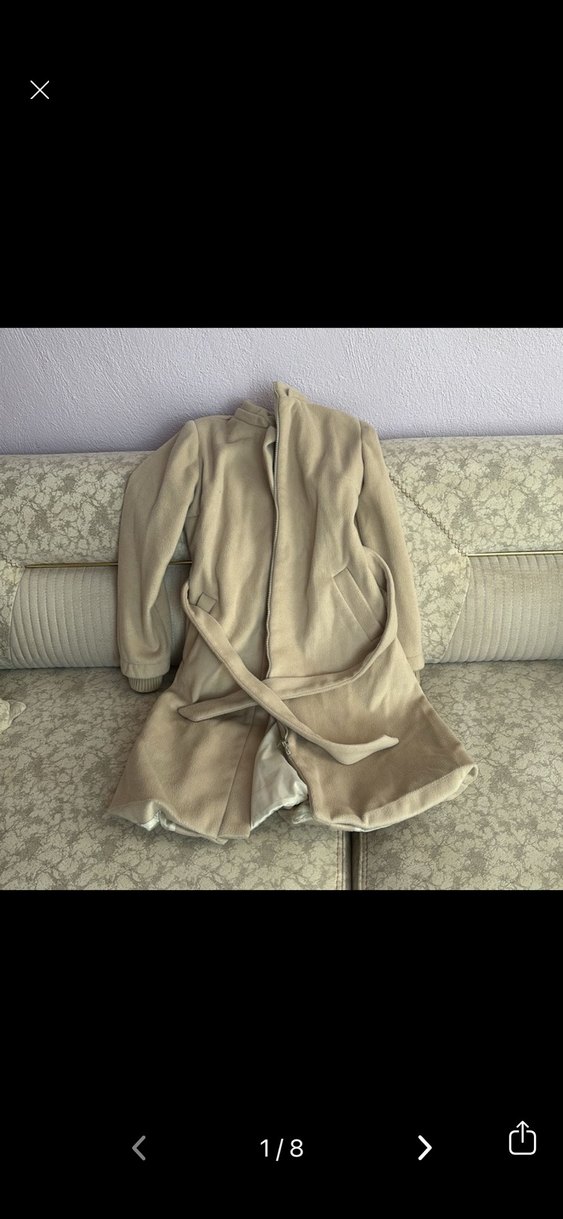 Yumuşak kumaştan yapılmış, kemerli ve kesimli bej renkli midi kaban. Uzun kollu ve notched yaka detayına sahip, günlük kullanıma uygun.