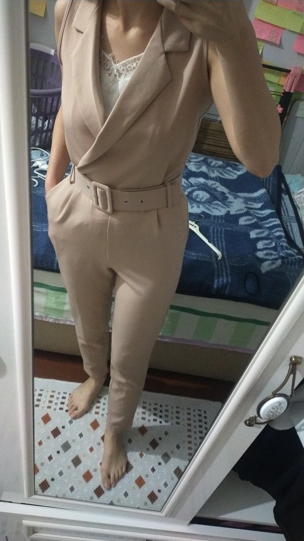 Bej renkte, kemerli ve yakalı midi tulum. Sentetik kumaştan, askılı kollu ve normal kesim, ofis için uygun. ✨1 kez giydim
