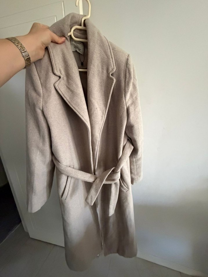 Bej renkte, yün kumaştan yapılmış bu kaban, kesik yaka ve kemerli tasarıma sahiptir. Midi boy ve düz desenlidir, rahat bir kesim sunar. pazarlık olur