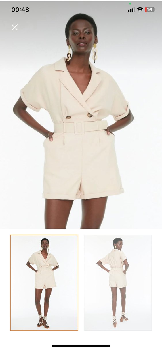 Bej renkli kısa tulum, notched lapel yakalı ve kısa kolludur. Yumuşak sentetik kumaştan yapılmış, kemerli ve rahat kesimlidir. Minimalist sokak stili için uygundur.