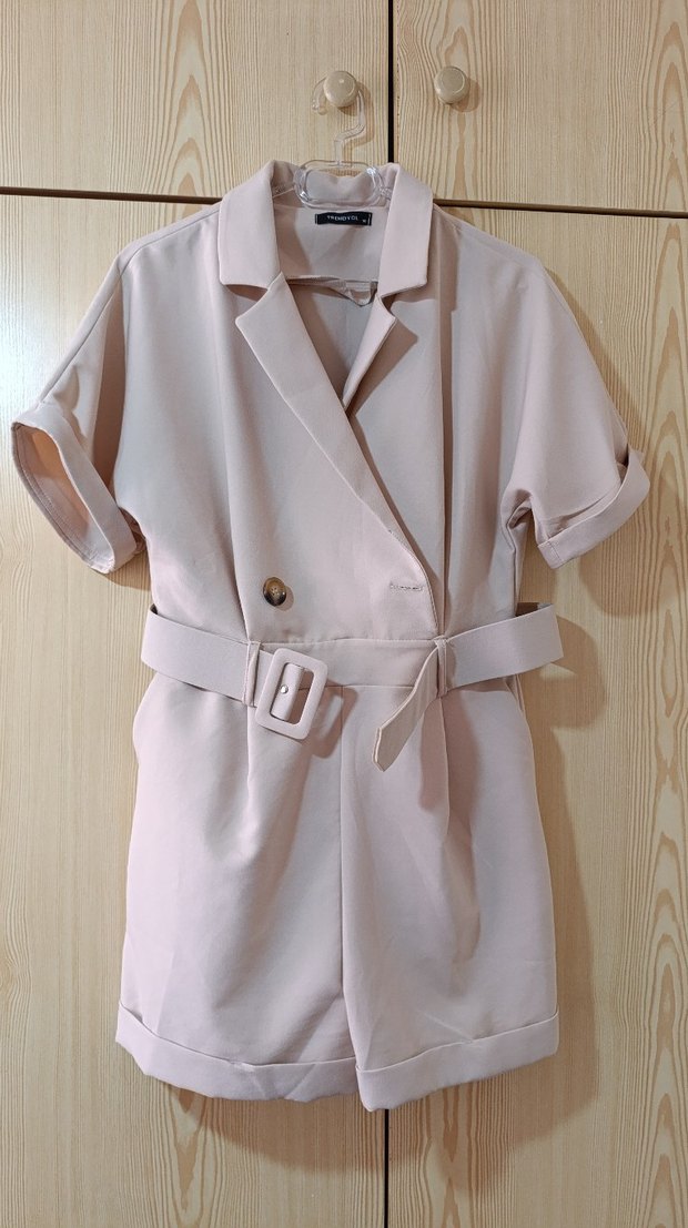 Bej renginde, kısa kollu ve kemerli kadın mini tulum. Notlu yaka ve regular fit ile sade bir tasarıma sahip. Sentetik kumaştan üretilmiştir. 2-3 saatliğine giyildi.Hiçbir defosu yok.Eski sezon trendyolmilla ürünü.