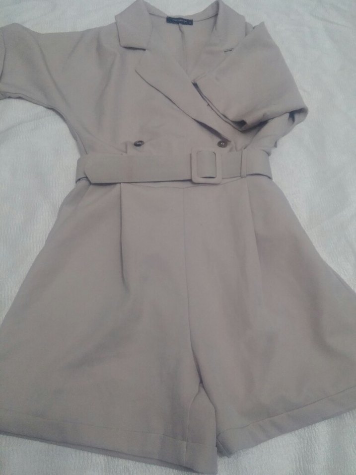 Bej renkli, kemerli ve kısa kesim kadın tulumu. Sentetik kumaştan, notched lapel yaka ve askılı kollarla rahat bir sokak stili sunar.