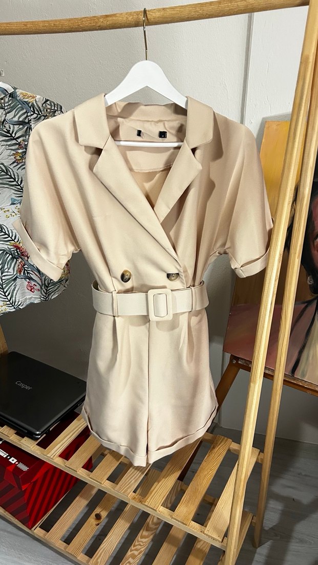 Bej renkli, kısa kollu, kemerli ve regular fit mini tulum. Sentetik kumaştan, notched lapel yakalı, günlük rahat sokak stili için uygun. Arkasında kedim tırmaladığı için bir kaç sökük var, fotoğraflarda belirtildi, ama duruşu mükemmel.