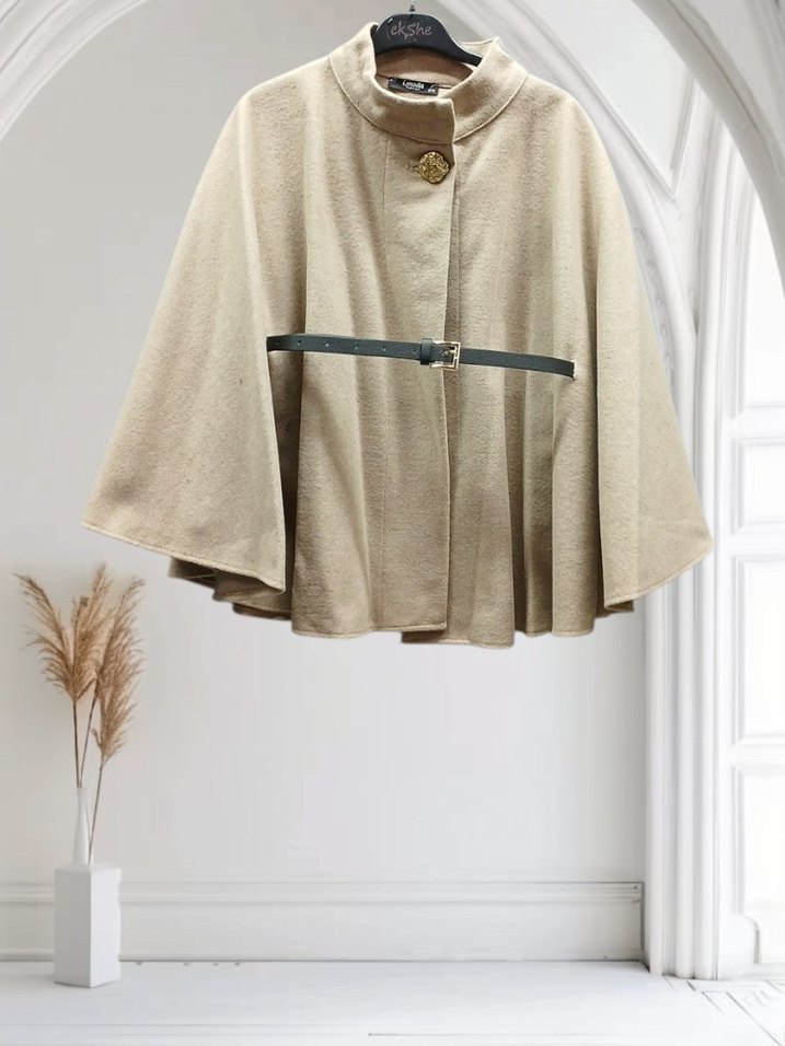 Bej renkte, kısa boyda, kemerli ve yaka detaylı, yumuşak ve sıcak kumaştan yapılmış bol kesim kadın panço.