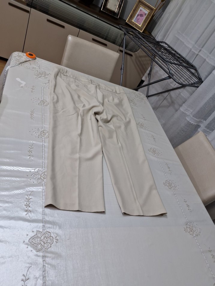 Bej kumaştan, kemerli, normal boy midi uzunluğunda, minimalist ve ofis stiline uygun kadın pantolonu bej rengi..