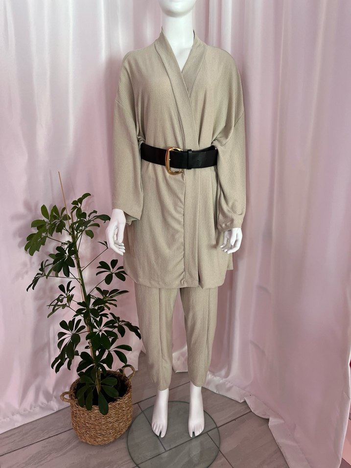 Bej renkte, keten kumaştan yapılmış, uzun ve regular fit kadın takımı. Kemer detaylı ve kesik yakalı, günlük ve iş stiline uygun.