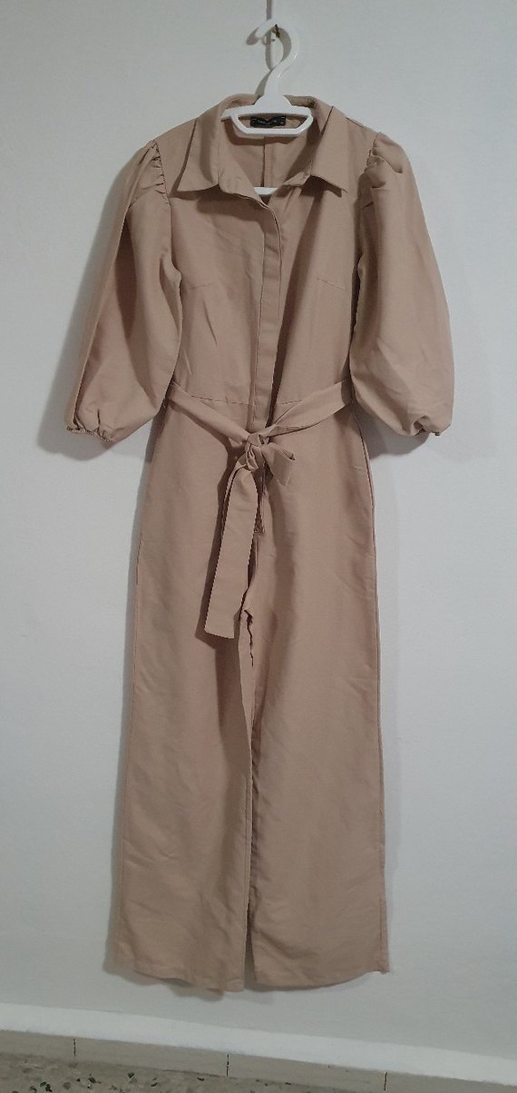Bej renkli, kemerli ve yakası kesimli uzun tulum. Keten kumaştan yapılmış, günlük kullanım için uygun sade ve rahat bir model. 36 38 bedene uyumlu