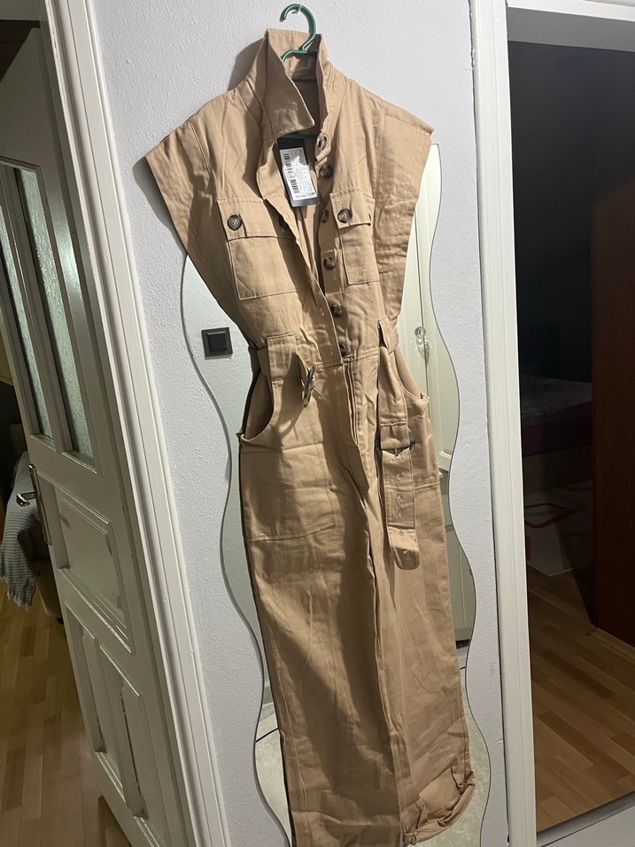 Bej renkte, kemerli ve yakalı, kolsuz uzun tulum. Sentetik kumaştan, rahat kesim ve sokak modasına uygun.