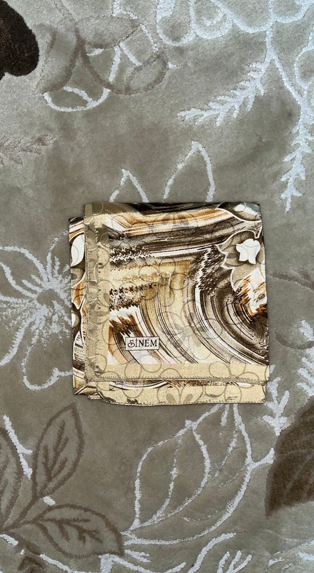 Bej keten kumaştan, kemerli ve vintage bohem tarzda kadın başörtü. Etiketsiz ve kullanılmamıştır