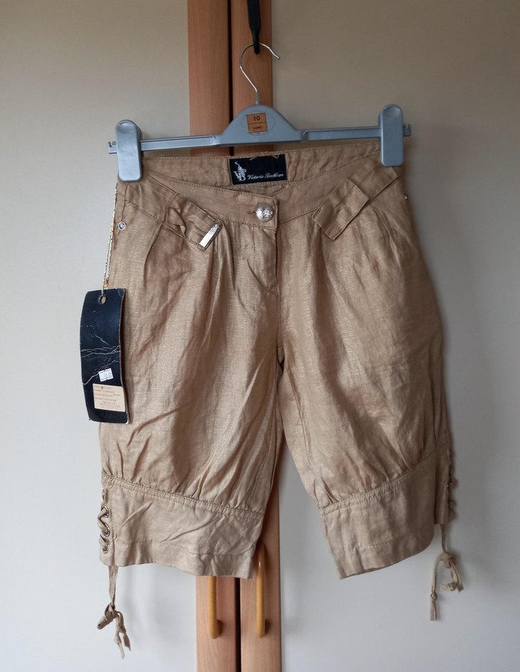 Bej renkli, kemerli ve keten kumaştan yapılmış, bol kesim kısa kadın Bermuda şort. Alt kısmında bağcık detayları bulunur, rahat ve şık dış mekan kullanımı için uygundur.