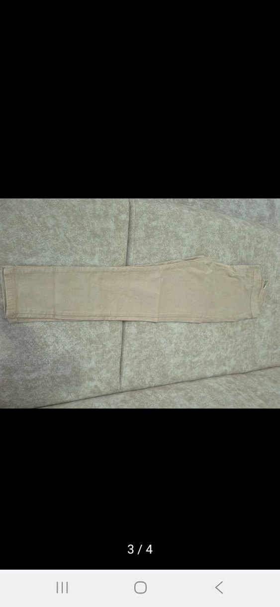 Bej renkli, yumuşak keten kumaştan yapılmış, kemerli ve düz tasarımlı kadın pantolonudur. Normal midi boy ve rahat kesime sahiptir, günlük kullanım için uygundur. Ürün hiç giyilmemiştir.