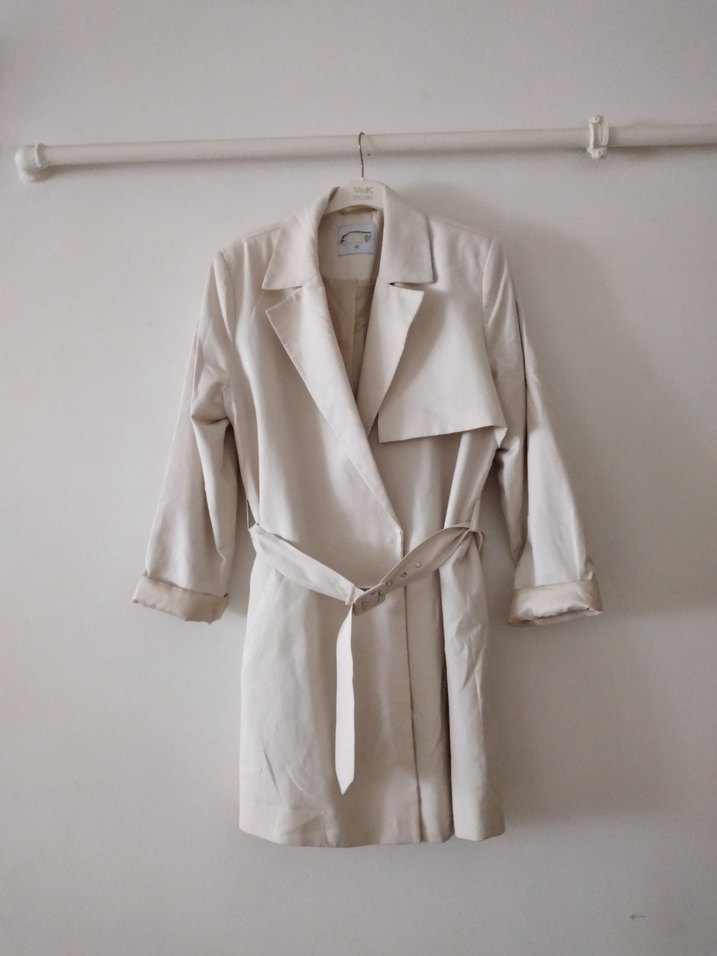 Bej Kemerli Keten Kadın Trençkot sırtında küçük defosu var