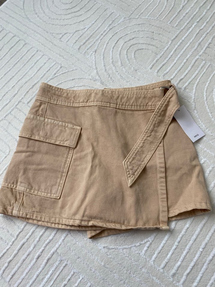 Bej renkli keten mini etek, kemerli ve bol kesimdir. Sokak tarzı için uygundur ve cep detayı bulunur. Günlük kullanım için idealdir.