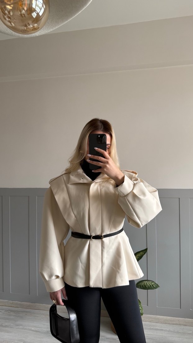 Bej renkli, kısa deri ceket yüksek yakalı ve uzun kolludur. Kemer detaylı, rahat kesimiyle günlük kullanıma uygundur. İş ve sokak stilini birleştirir. M-L UYUMLUDUR