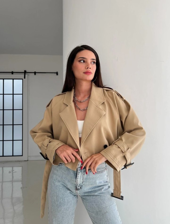 Bej renkli kısa deri trençkot, kemerli ve bol kesimdir. Notch yaka ve uzun kolludur, günlük rahat kullanıma uygundur yeni sıfır bedeni standarttır