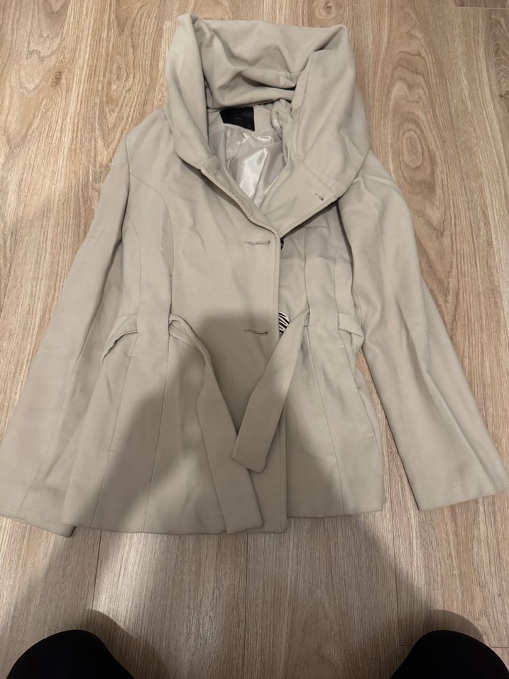 Bej renkli kısa kaban, kemerli bel ve yakası kesik detaylıdır. Uzun kollu, düz ve sentetik kumaştan yapılmıştır. Günlük ve iş stiline uygundur. ✨