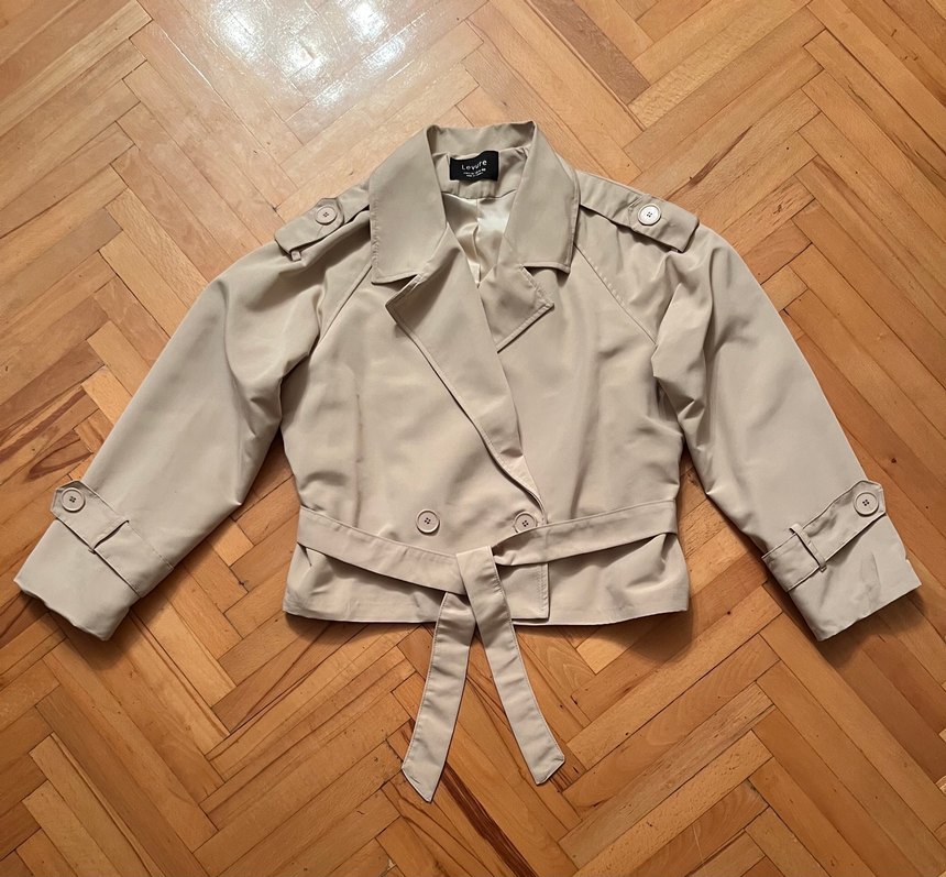 Bej renkli, kemerli ve kısa boy trençkot, yakası kesik ve askılı kolludur. Sentetik kumaştan yapılmış, ofis için uygun, rahat kesim ve sade tasarıma sahiptir.