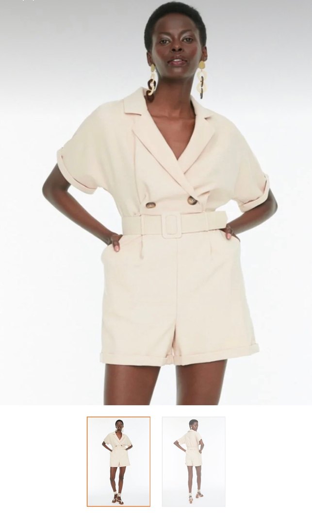 Bej renkli, kısa kollu, kemerli ve kısa boy tulum. Pamuk kumaştan üretilmiş, rahat ve şık bir günlük kullanım seçeneği sunar.