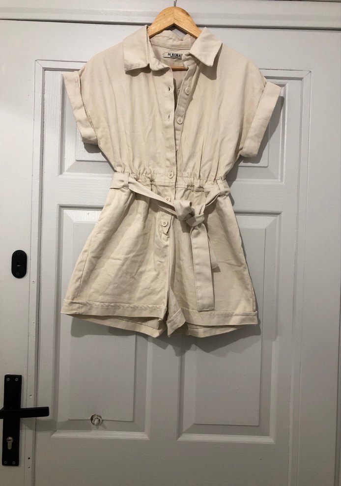 Bej renkli, kısa kollu ve kemerli kadın tulumu. Yumuşak keten kumaştan üretilmiş, gevşek kesim ve düz desensiz tasarıma sahip, günlük kullanıma uygun.75 cm boyu şort boyu lastiğle bel arası 36 krem renk