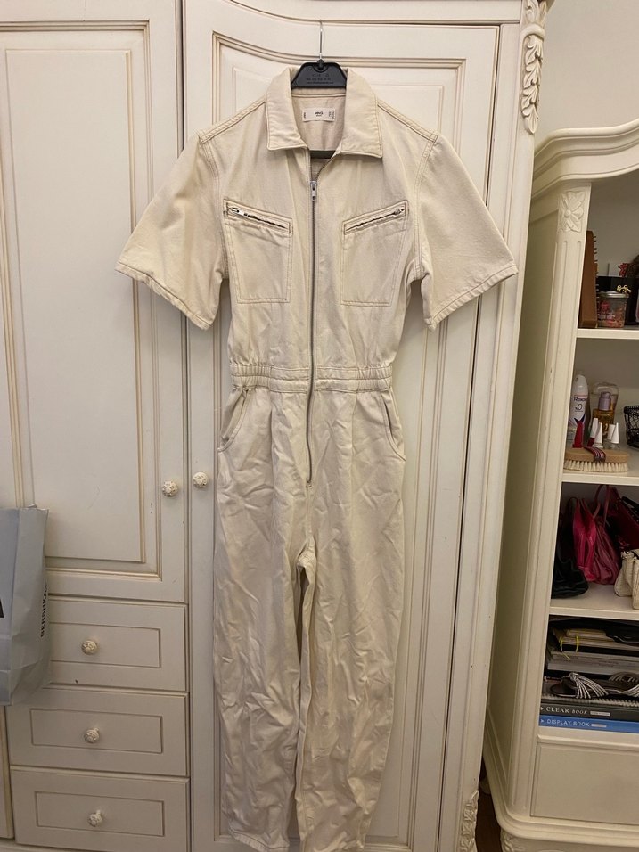 Bej renkli keten kumaştan, kısa kollu, kemerli ve notlu yakalı, midi uzunlukta kadın tulum. Sokak modasına uygun vintage tarzda, günlük kullanım için ideal.