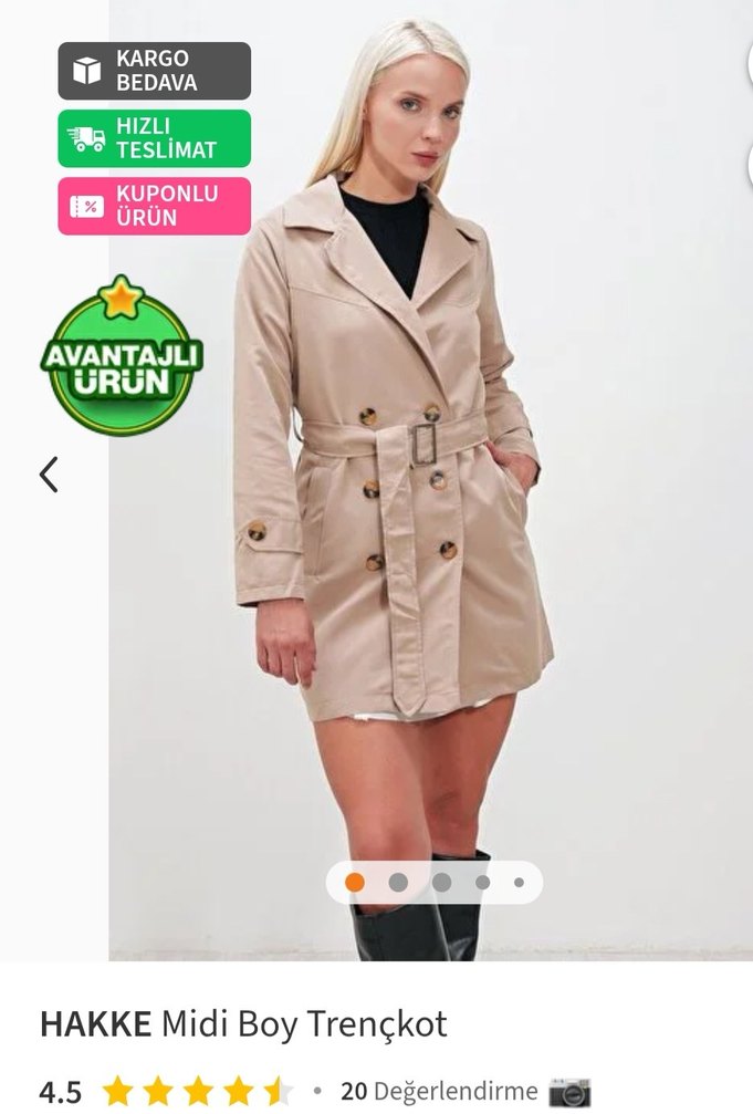 Bej renkli, midi boy, cepli, düğmeli ve kemerli trençkot. Uzun kollu, keskin yakalı, düz ve sentetik kumaştan yapılmıştır. Günlük ve iş tarzına uygundur. Hiç giyilmemiştir. ♀️
