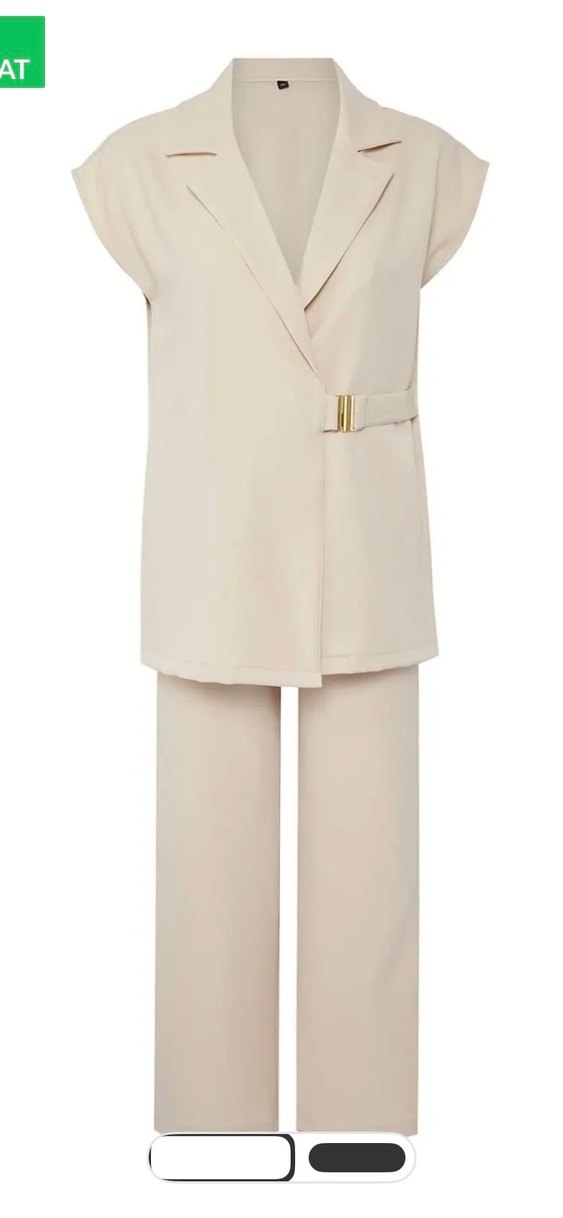 Bej renkli, kolsuz kadın takımı, kemerli ve kesimli yaka detaylıdır. İpek gibi kumaştan, normal kesim ve midi boyda, ofis için uygundur. Bir kere giyildi