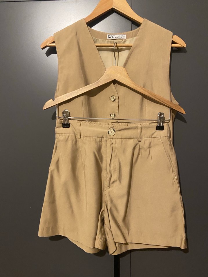 Bej renkte, kolsuz kısa takım, keten kumaştan, kemerli ve kesik yaka detaylıdır. Ofis için uygun, rahat ve şık bir seçimdir.