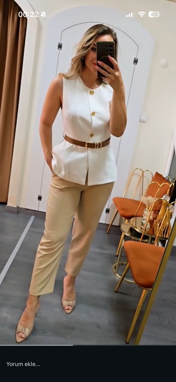 Kemer detaylı, kolsuz bej deri yelek. Notlu yakası ve altın düğmeleri ile şık, ofis için uygun bir parça. İKİLİ TAKIM. Yelek + Havuç Pantolon. BU FİYAT KAÇMAZ