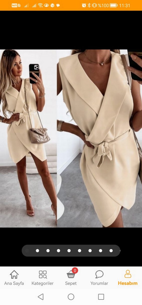 Kemerli, V yaka ve kolsuz tasarıma sahip bej mini deri elbise. Günlük kullanıma uygun, şık ve modern görünüm sunar. Ürünü hiç kullanmadım. Mağazadan alındığı gibidir.