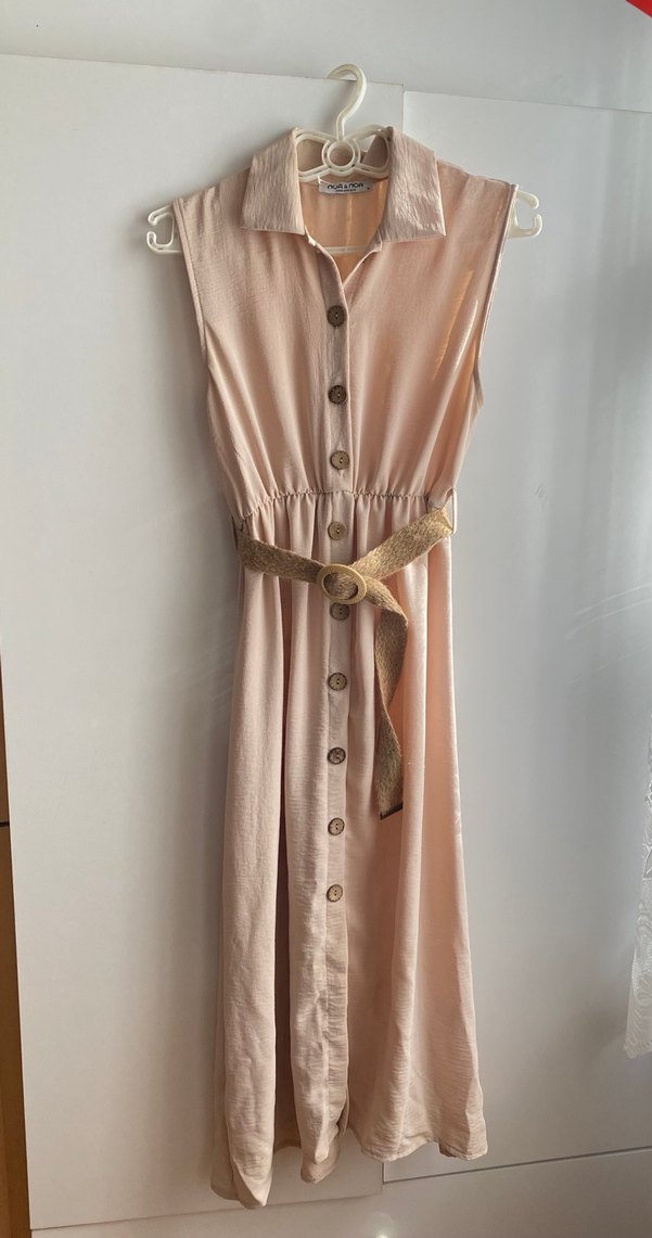 Yumuşak keten kumaştan yapılmış, kolsuz, bej uzun elbise. Düğmeli ön kısmı, yakalı tasarımı ve kemerli beli ile sade bohem tarzda, günlük kullanıma uygun.