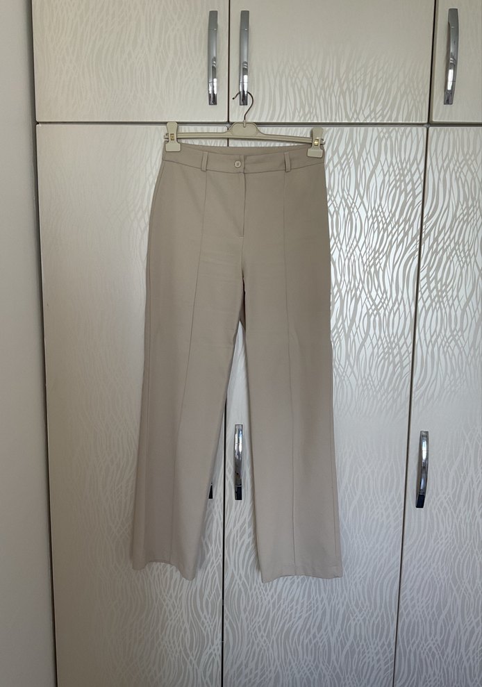 Bej renkli, kemerli, normal boy midi kesim kadın kumaş pantolon. Ofis için uygun, düz ve desen içermeyen tasarım.