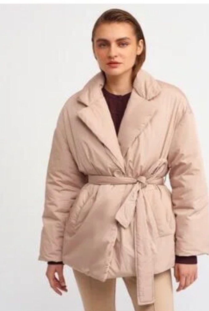 Bej renkli, kemerli bel ve kesik yakalı kadın mont. Bol kesim, uzun kollu ve midi boyda, yumuşak sentetik kumaştan günlük rahat kullanım için uygun.
